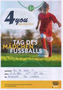 Wir laden alle Mädchen ein beim Tag des Mädchenfußballs reinzuschnuppern. Ab 16 Uhr geht es los ! Zuerst alle Mädchen bis 13 Jahren (bis 17.30 Uhr) und ab 17.30 Uhr sind alle Mädchen ab 14 Jahren willkommen ! Kommt einfach vorbei und probiert Euch aus. Es erwarten Euch ein paar Übungen und viel Spaß !
